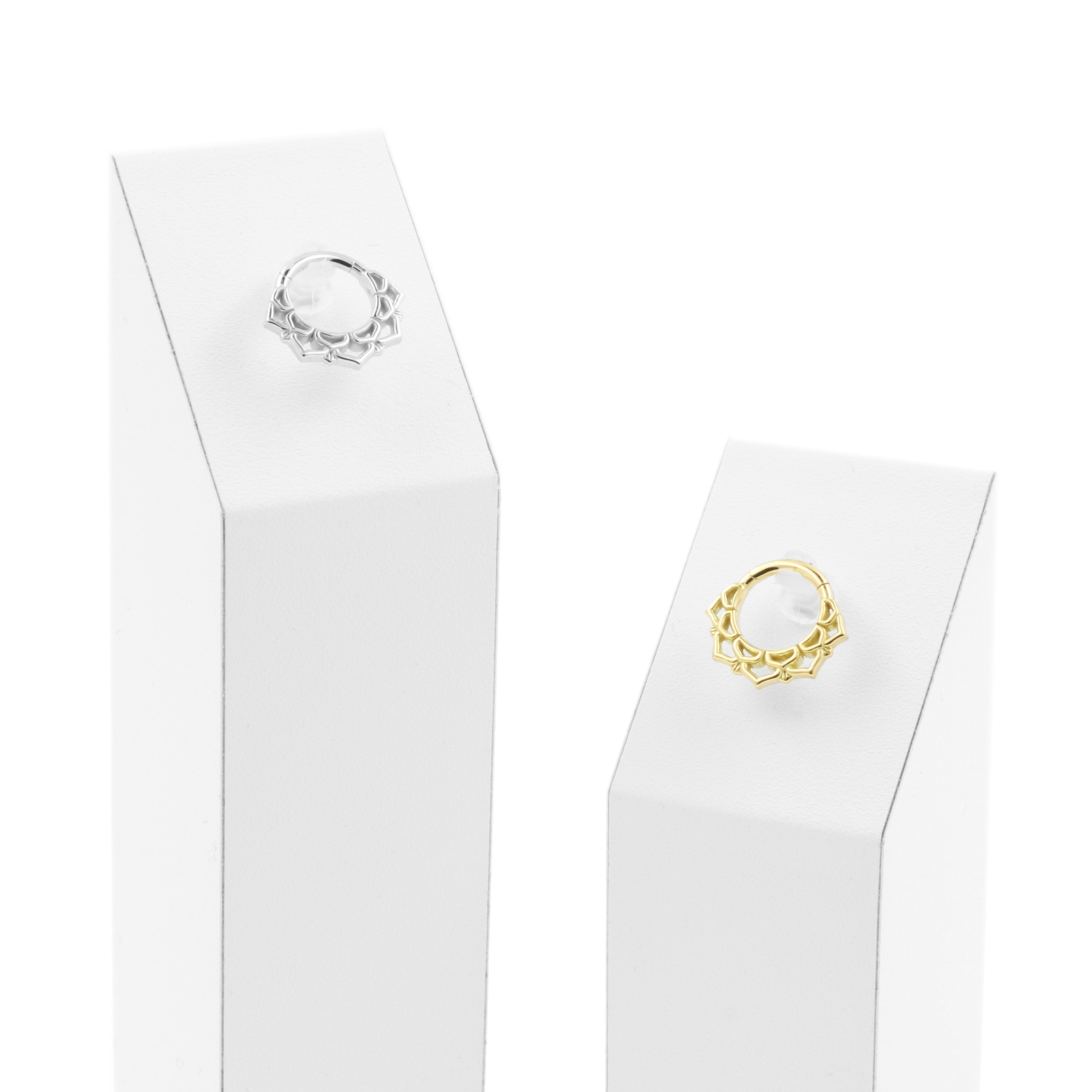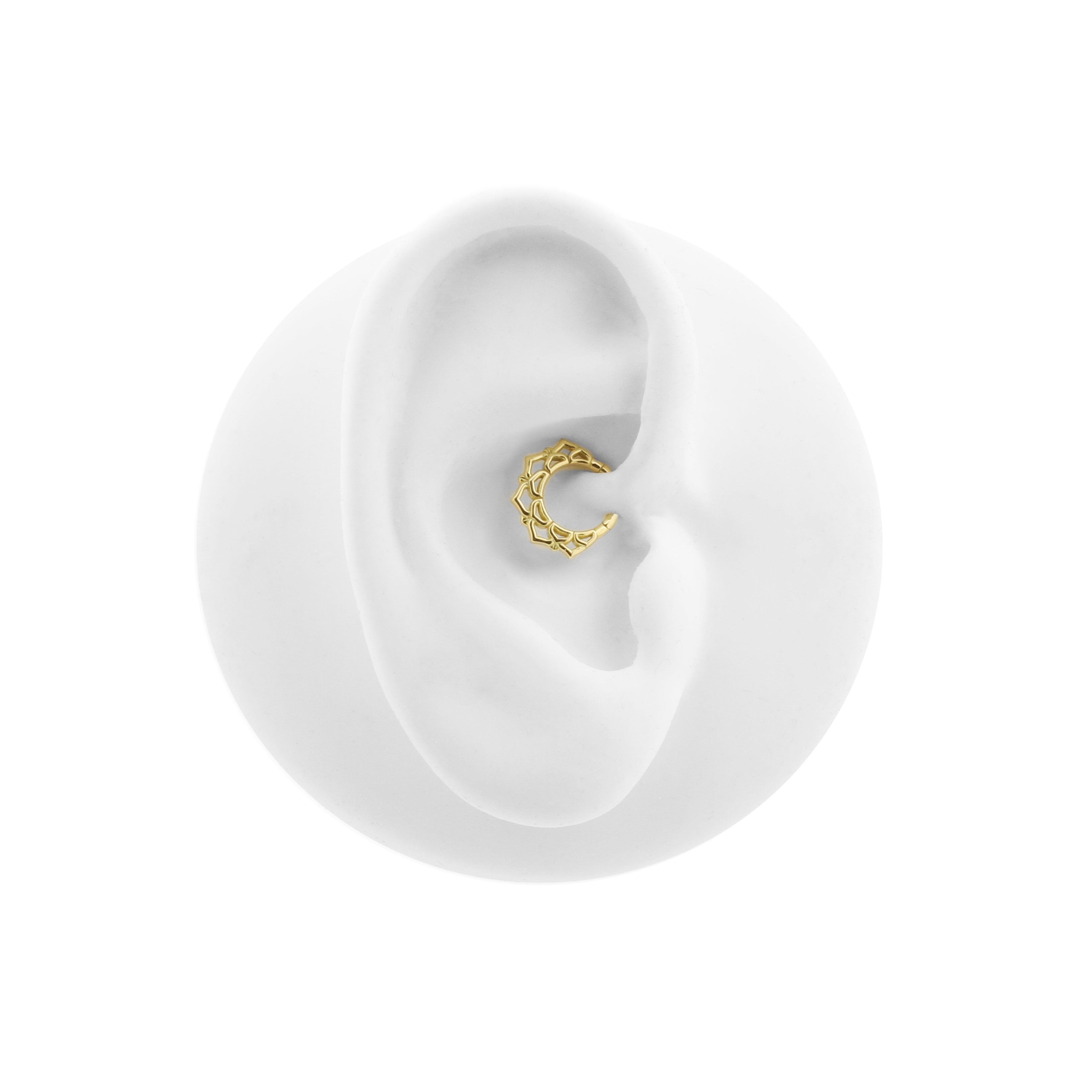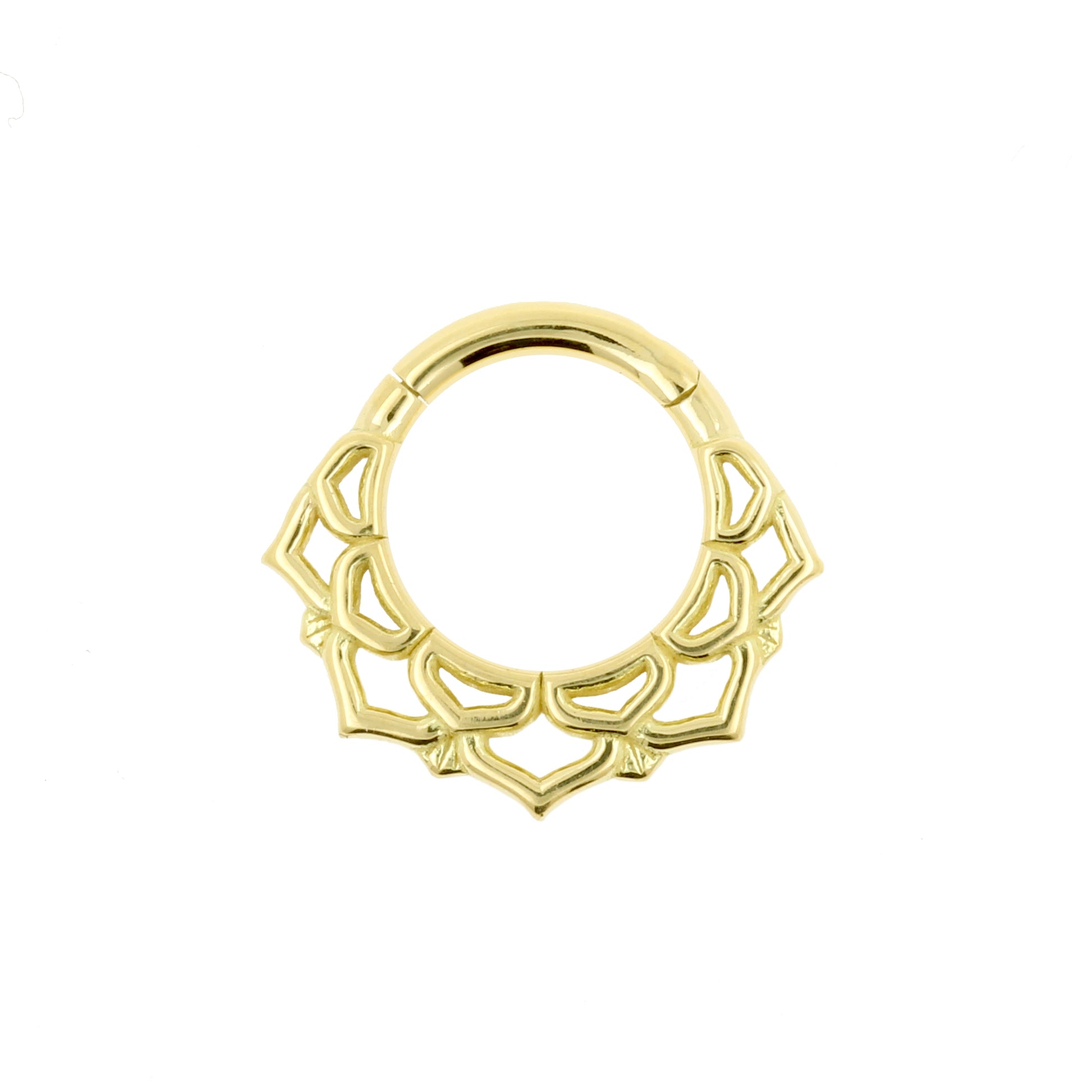 It all clicks with these amazing piercing click rings! Easy to use click ring made of 18 karat gold with lovely decoration at the bottom of each ring. Comfortable and very easy to use. The segment of this click ring is hinged and can easily be opened and closed, which allows a smooth insertion into your piercings. The oval shape is perfect for all kinds of piercings, but especially for daith piercings.