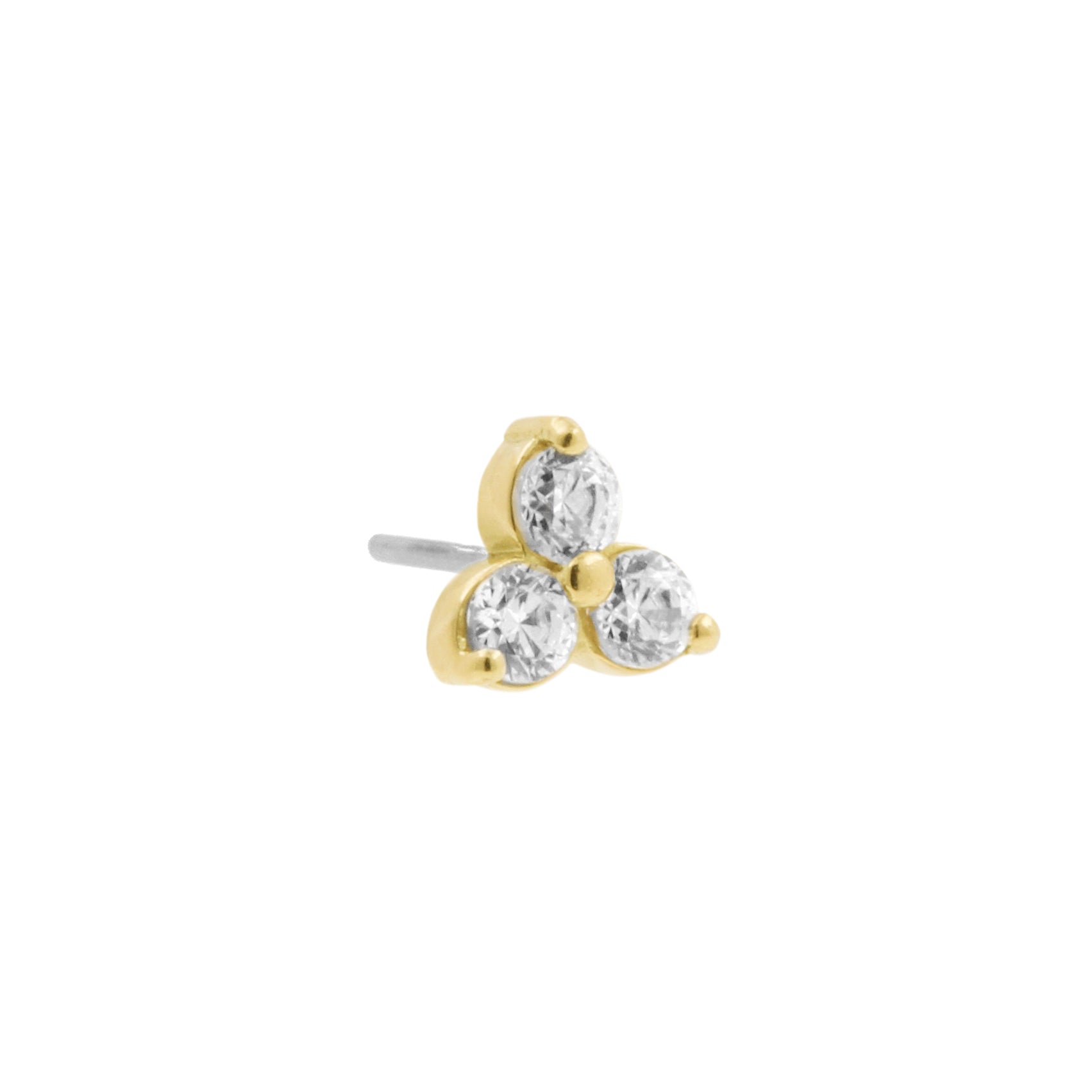 A warm and elegant trinity top crafted from 18‑karat gold, featuring three bright, sparkling zirconia stones. Its compact shape and rich gold shine make it a timeless classic.