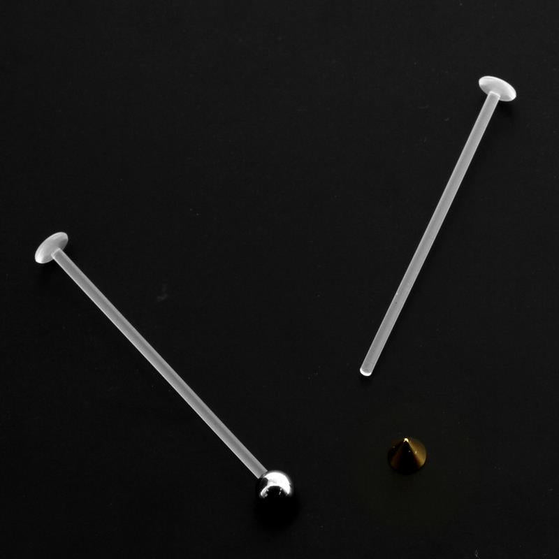 Bioplast is a light and flexible polymeric material specifically developed for piercings. The end of this labret stud is not threaded, so make sure you pre-tap the thread before you start wearing your jewelry. Simply screw and unscrew with a metal threaded ball of a Bioplast threading tool. When deciding to cut these posts to your desired length, make sure you save a bith of length to screw on the accessory. Then, simply cut the post to your desired length, add some thread to the end and you're good to go. Please note that you will receive the seperate post only upon ordering, without threaded balls or other accessories.