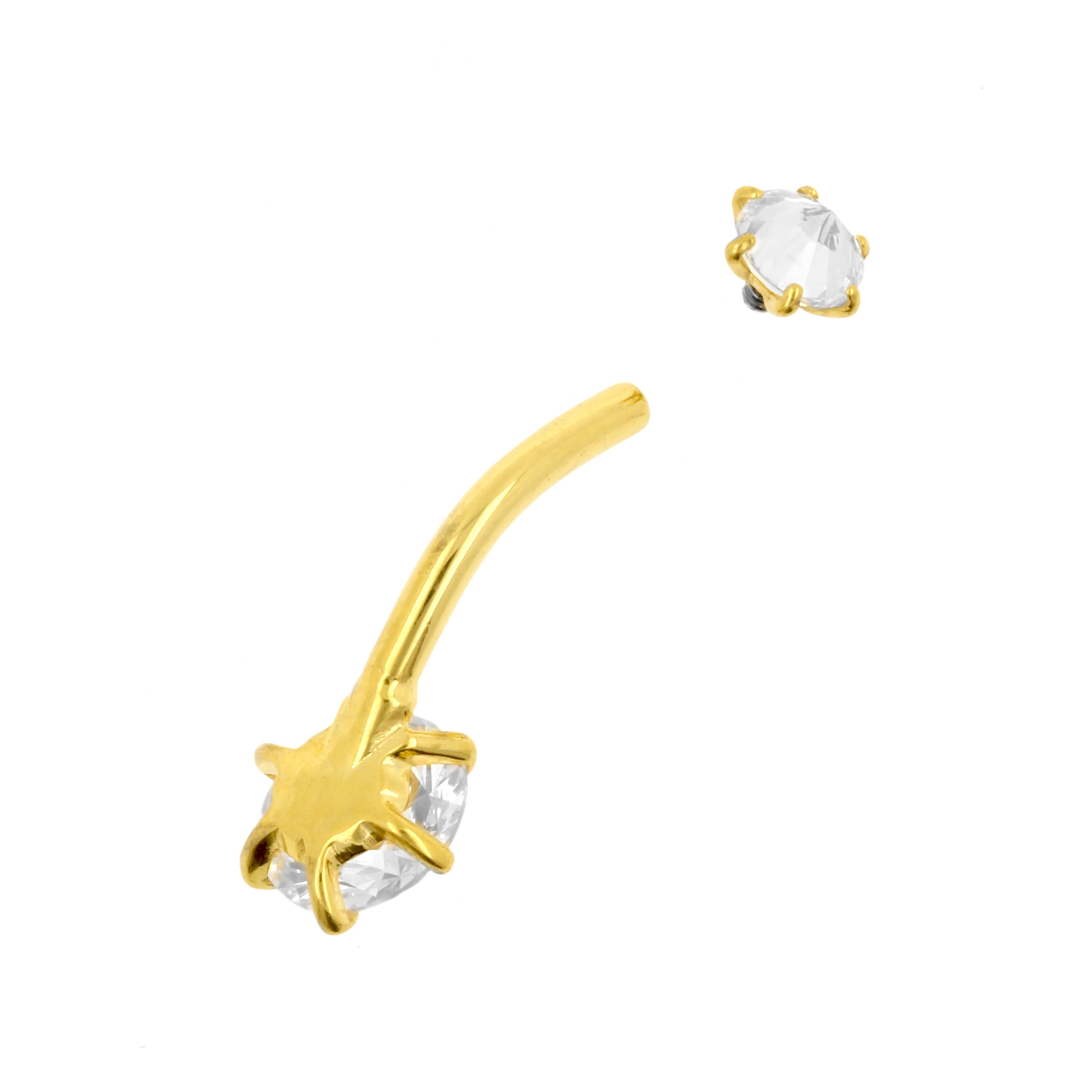 Elegant and refined — this belly bar highlights a clear cubic zirconia that catches the light beautifully. The 24 karat P.V.D. gold coating on surgical steel adds a warm, luxurious finish that lasts. The coating is water-resistant and color-stable, ideal for everyday wear.