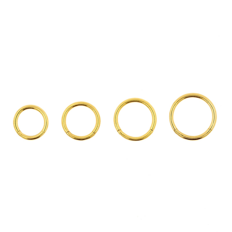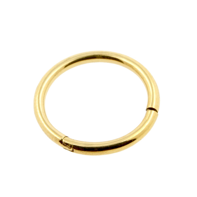 Pretty basics! The perfect piercing ring if you like the look of a smooth segment ring, but need something that's easy to use as well. The segment of this click ring is hinged and can easily be opened and closed. The closing mechanism is very easy to use and allows a smooth insertion into your piercings. Made of surgical steel and available in different colors and sizes!