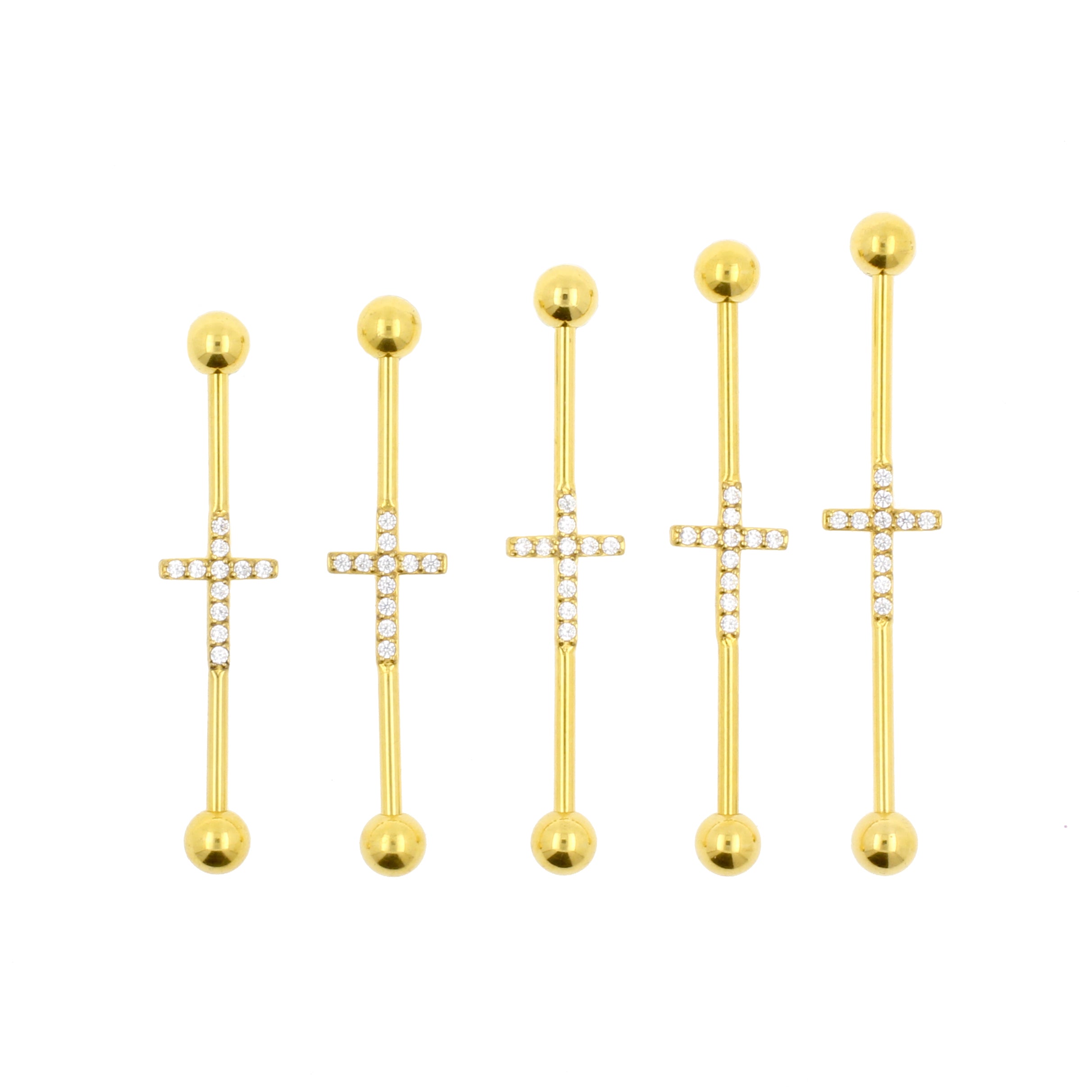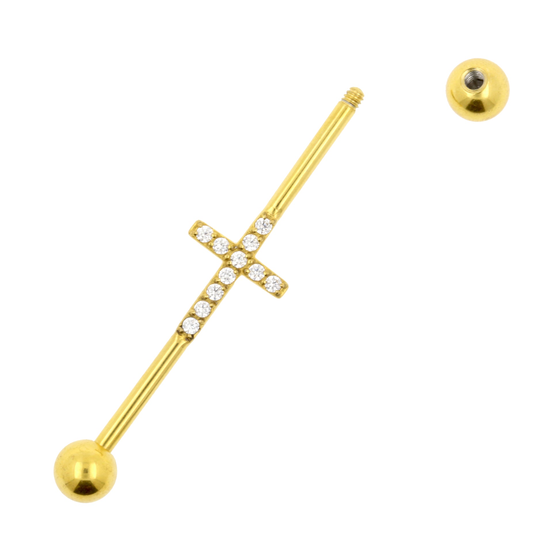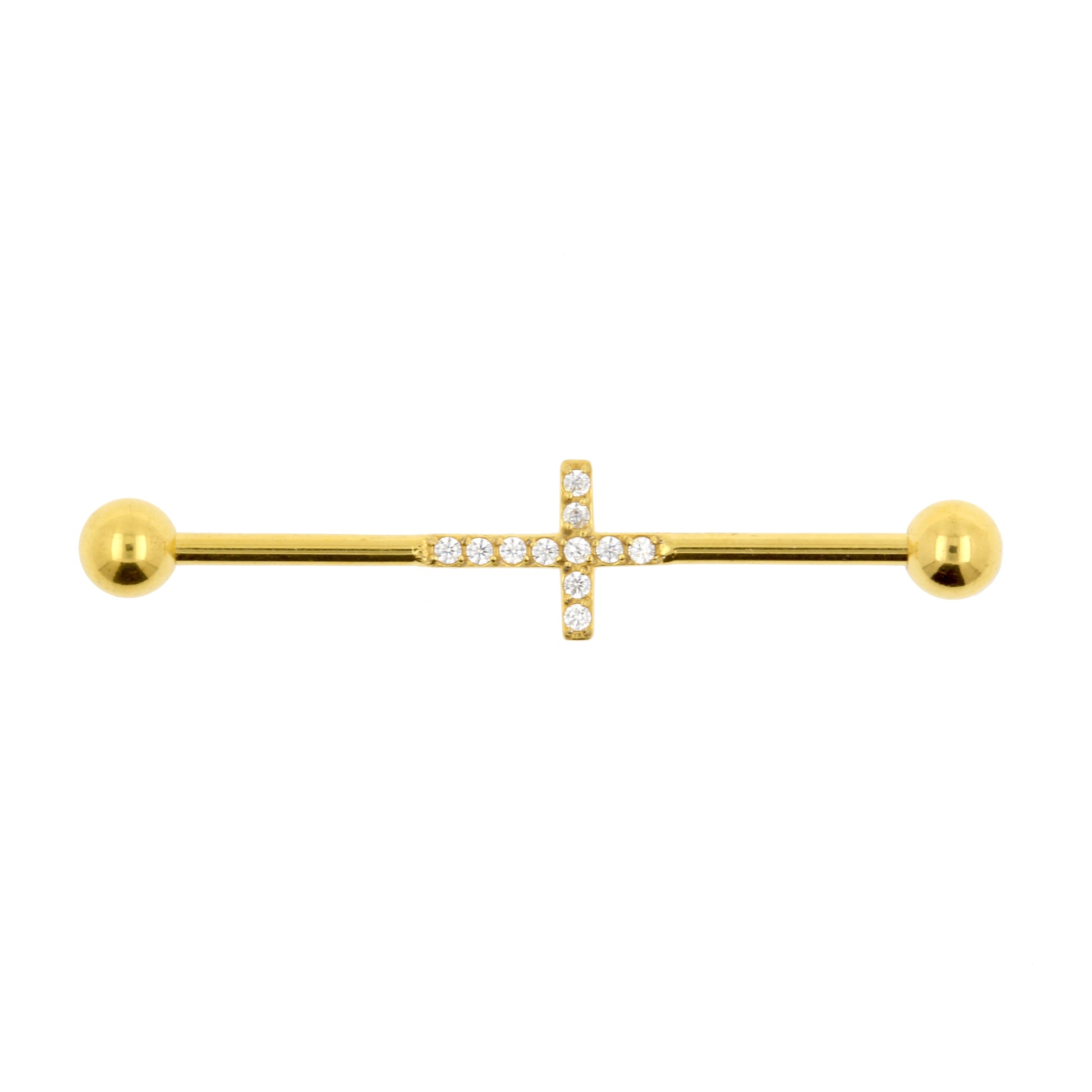 Surgical Steel Jewelled Industrial Barbell - Cross Gold