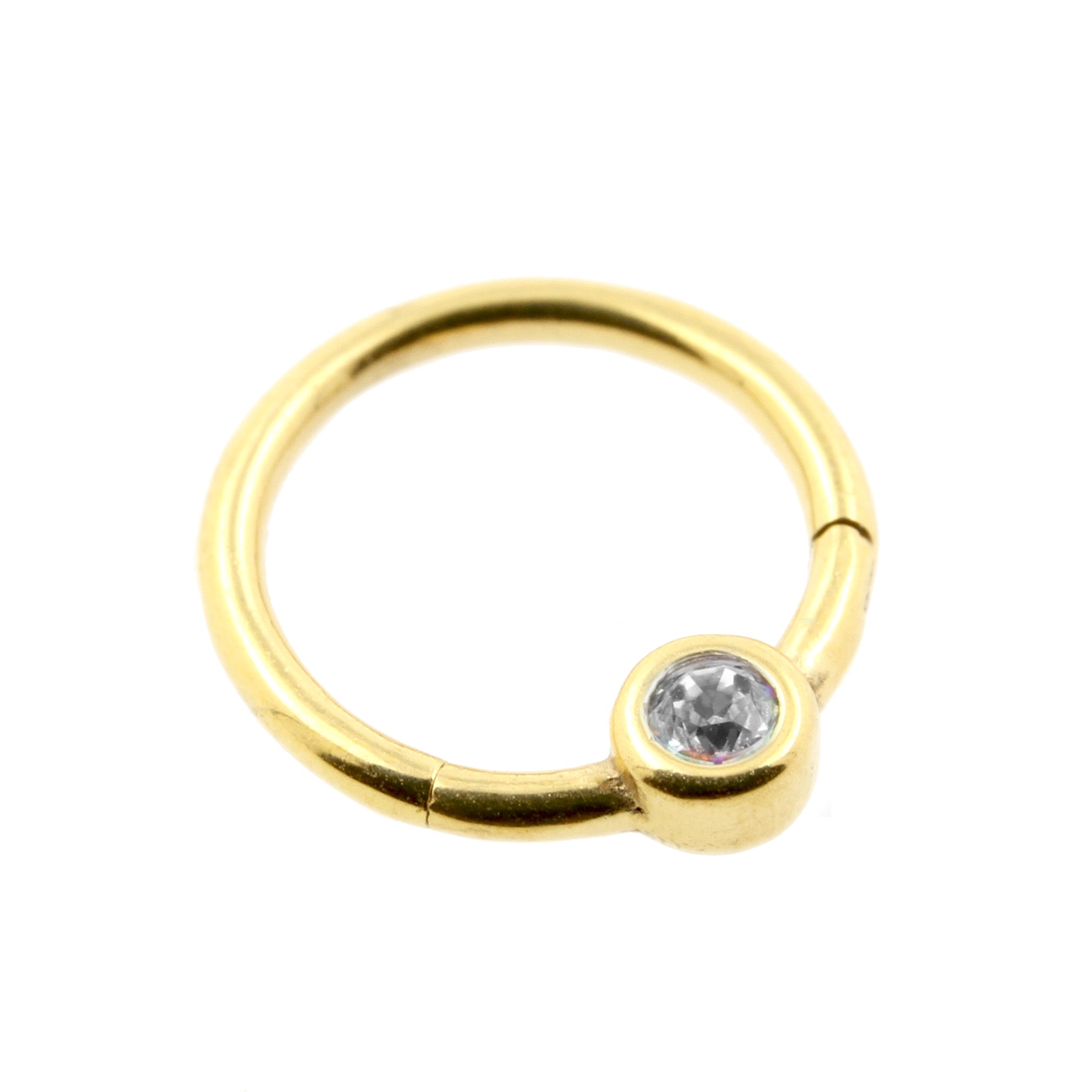Easy to use click ring for your Smile piercings! This click ring is made of surgical steel and set with a fixed, jewelled bead at the bottom of the ring, giving the ring the appearance of a ball closure ring but without the opening and closing hassle! Our click rings are perfect for all kinds of piercings and very easy to use. The segment of this click ring is hinged and can easily be opened and closed. Simply open the ring, insert it into your piercing and click it shut. Done!