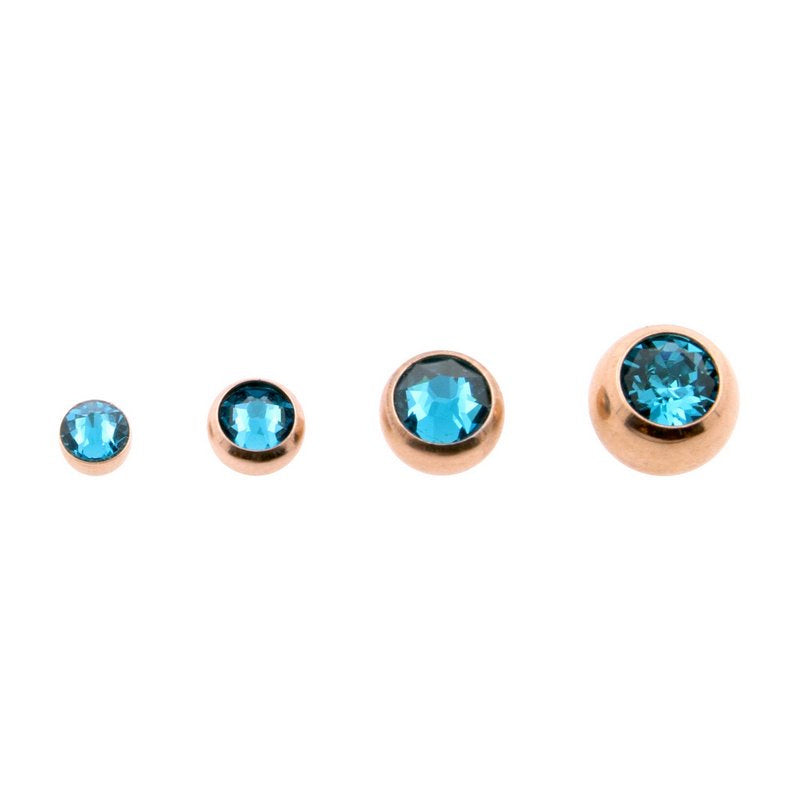 The essential basics, with a touch of rose gold! These threaded, jewelled balls are are set with a small crystal and made of surgical 316L steel, with a rose gold P.V.D coating. The new coating techniques that are used to create this piece of jewelry ensure top notch quality and a wear-resistant, high sheen finish. Great to keep at hand whenever you need a replacement, or simply want to switch to another size. Our threaded balls are a perfect match with our rose gold P.V.D. coated piercing jewelry range.