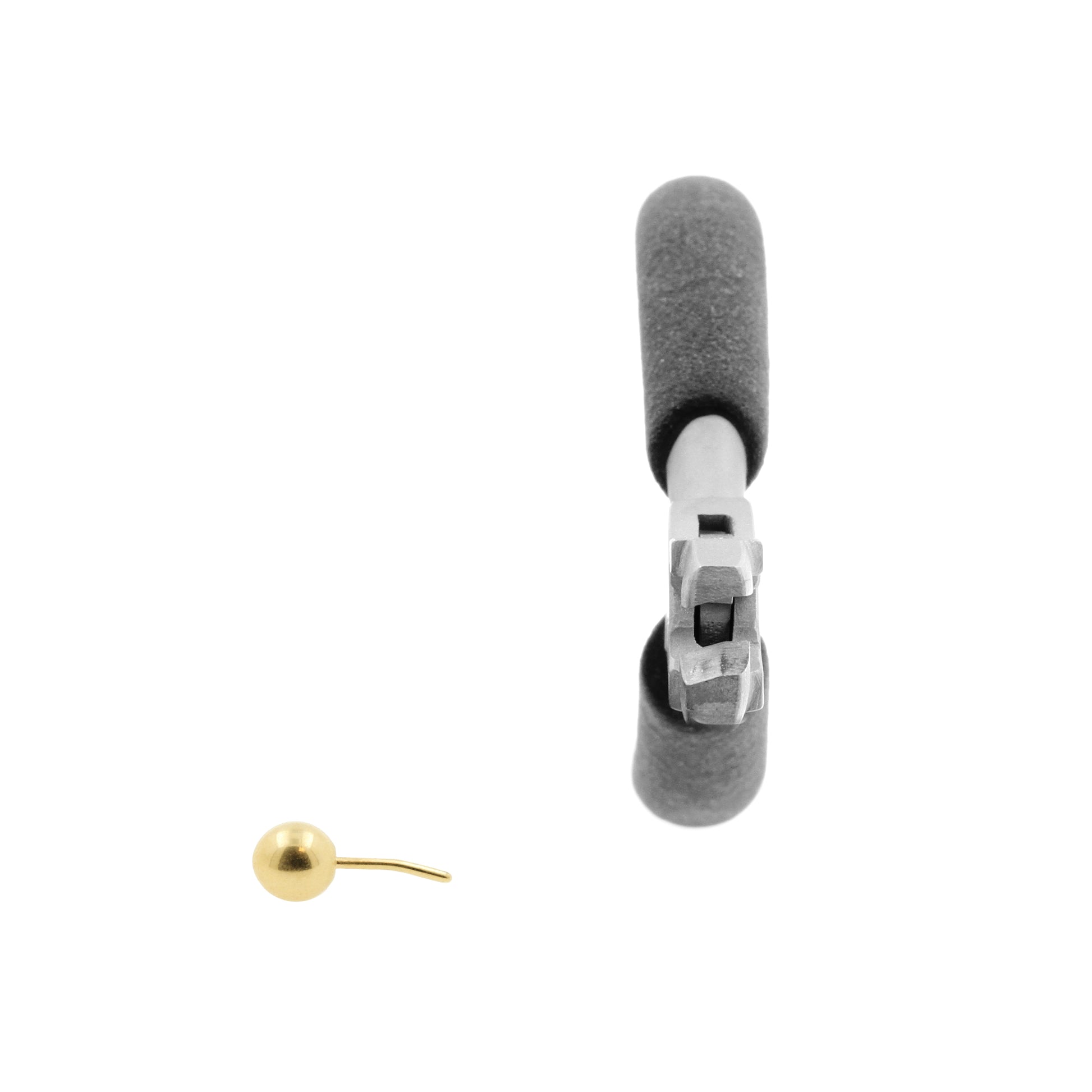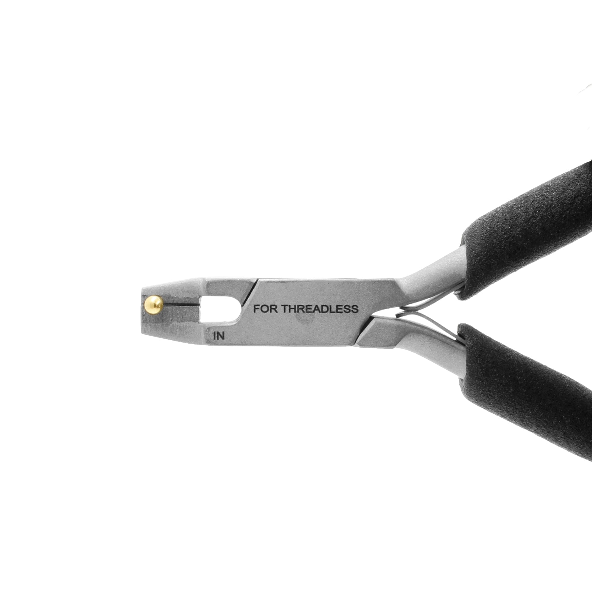 Threadless jewelry pins need a slight pre-bend so they grip securely inside the threadless bar. This tool makes that process easy and safe, without holding the accessory itself. Only the pin goes into the jaws, preventing damage or breakage of the top while bending. Place the pin in the pliers, gently squeeze, and it will form the ideal curve for a perfect fit.