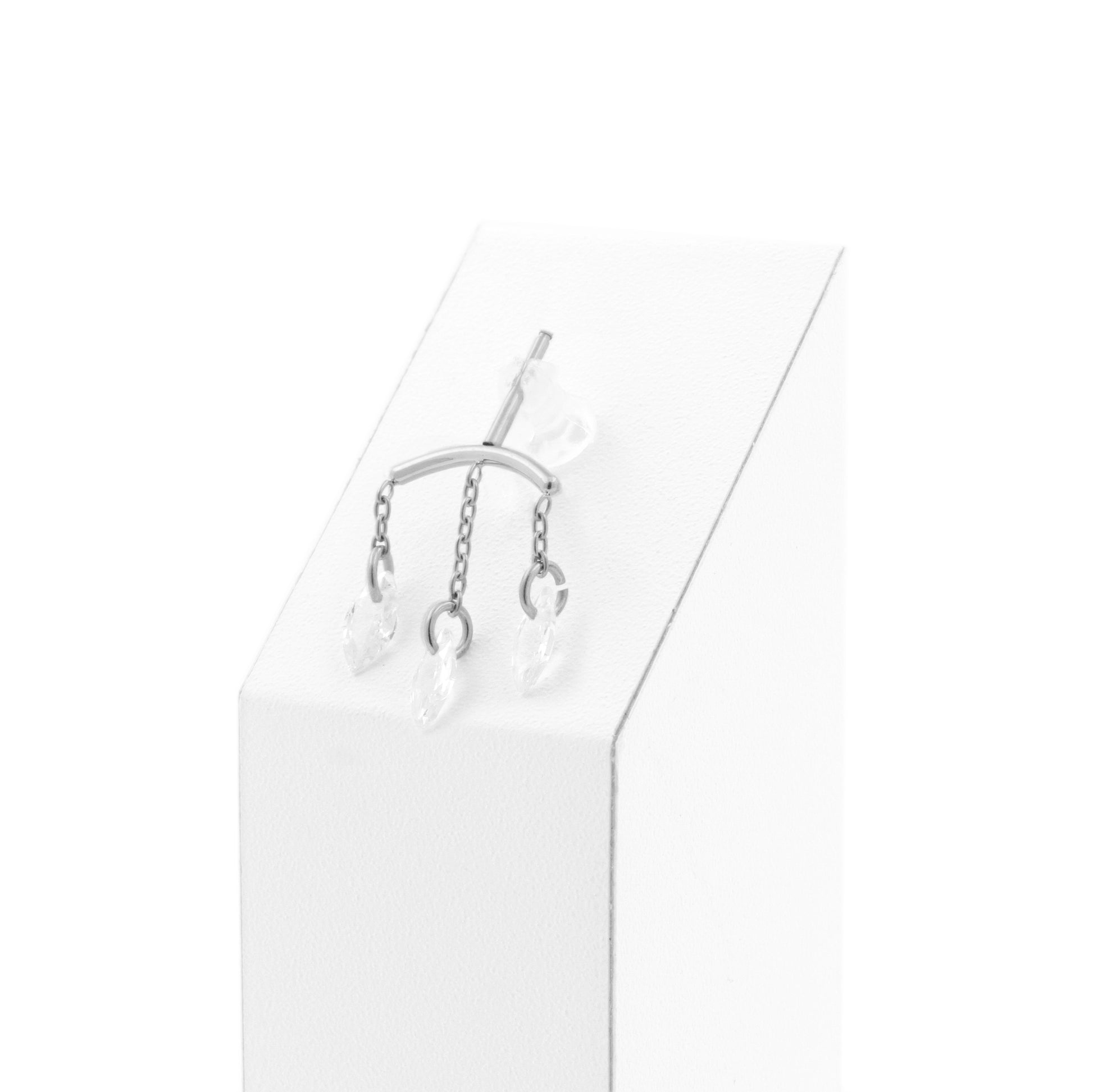 Give your vertical helix piercing an elegant look with this titanium curve, featuring dangling sparkling clear cubic zirconia. The titanium is finished with silver-colored PVD CoCr coating with the look of white gold (nickel-free). This piece is internally threaded and compatible with 1.2 mm internally threaded bars, ensuring safe and comfortable wear.