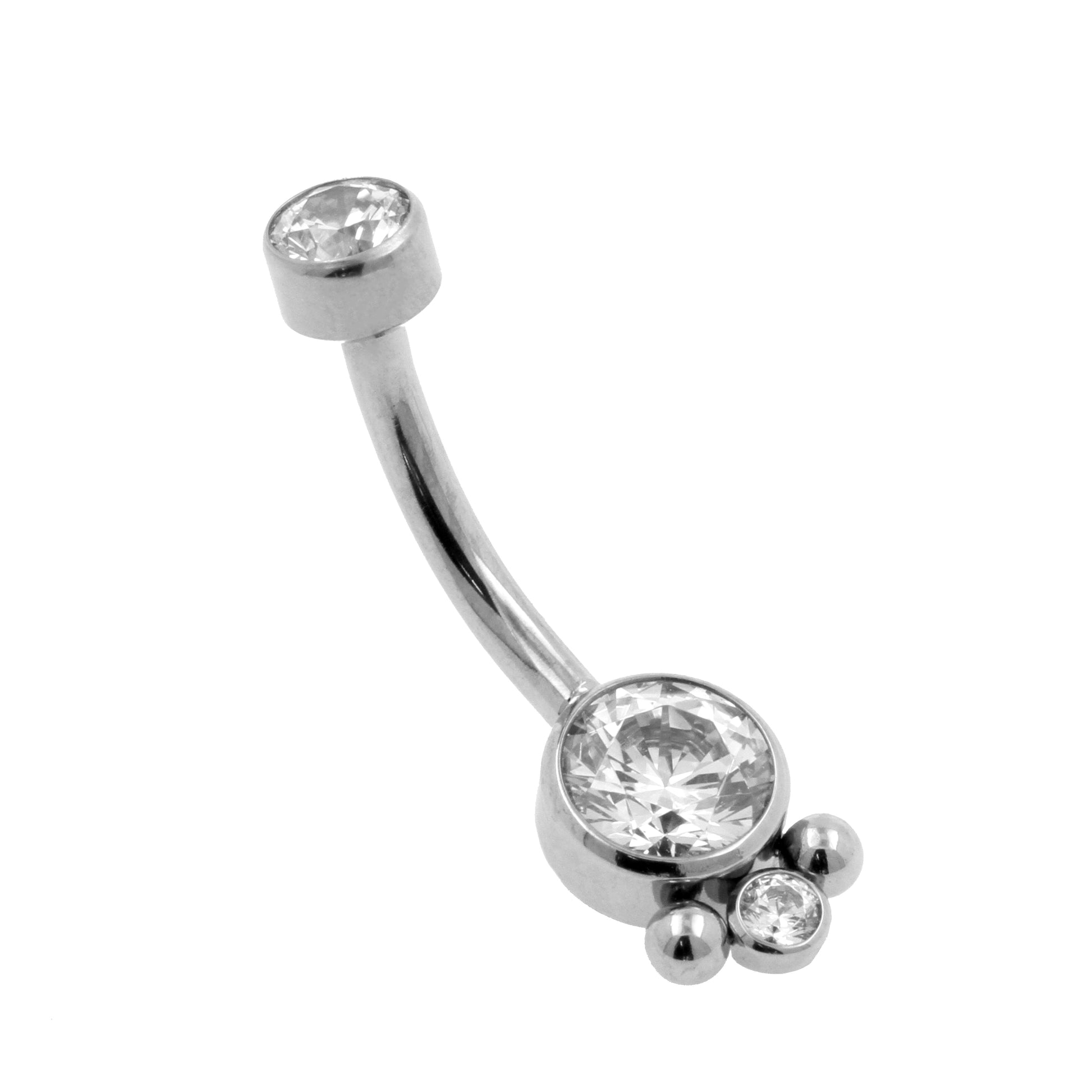 Stand out in the crowd with our Titanium Cluster piercing jewelry! This internally threaded belly ring measures 1,6 mm in thickness and is available in different lengths, perfect for pierced navels. The front of each belly ring is set with a beautiful cluster with genuine zirconia. Made of high quality titanium and fitted with internal thread, which makes changing your jewelry a lot more comfortable. Swap out your regular navel jewelry for these one of a kind pieces now, and turn your belly ring into a real eyecatcher! (Extra info: the thread of the accessory measures 1,2 mm in thickness and is compatible with other 1,6 mm internally threaded piercing jewelry from our shop.)