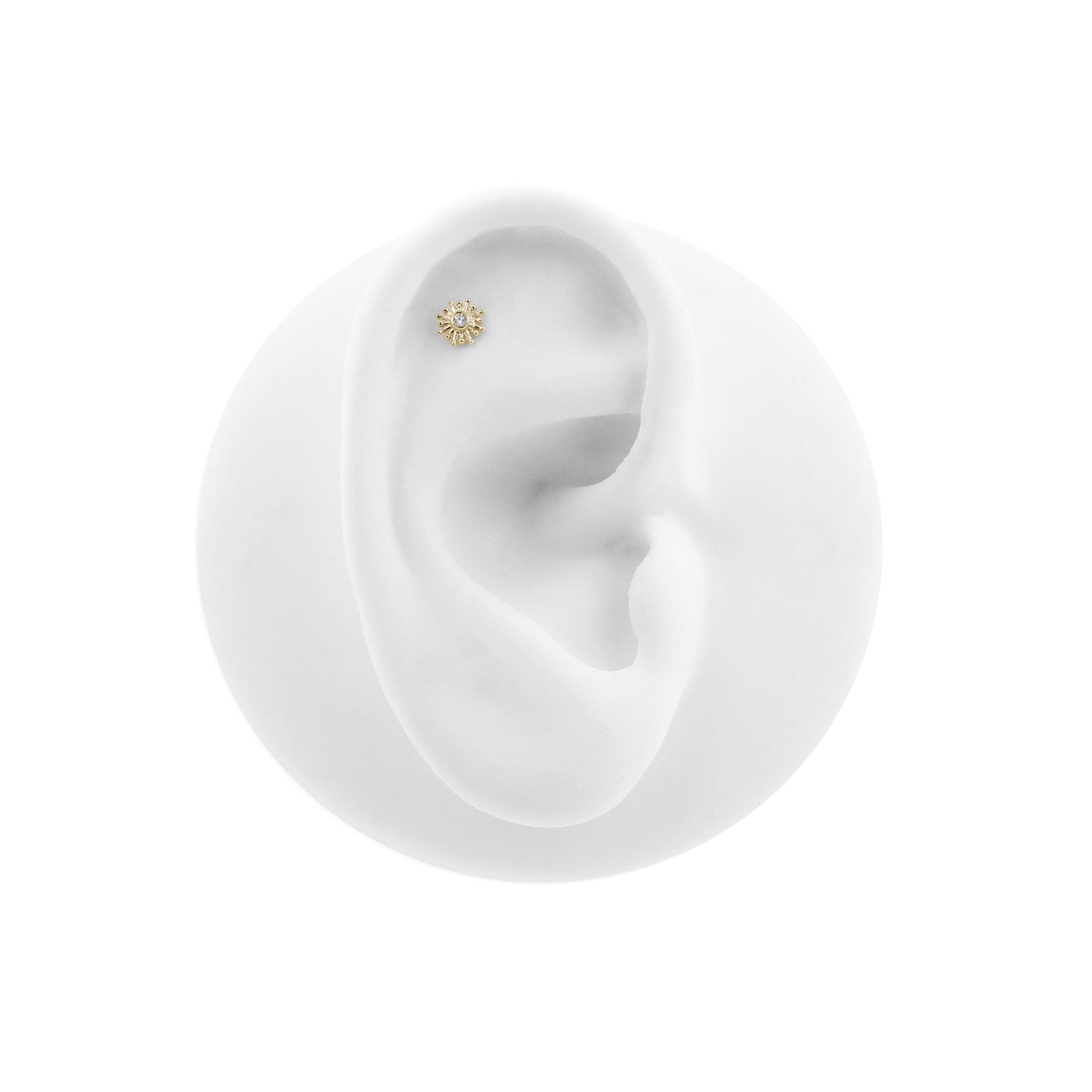 14 Karaats Gouden Dotted Zon Met Zirkonia geeft je piercing direct een stijlvolle uitstraling. Deze Threadless Top is vervaardigd uit 14 Karaats Goud. Dankzij het threadless systeem combineer je deze top eenvoudig met al onze staafjes, die wij Threadless Base noemen, voor een perfecte pasvorm en ultiem draagcomfort.