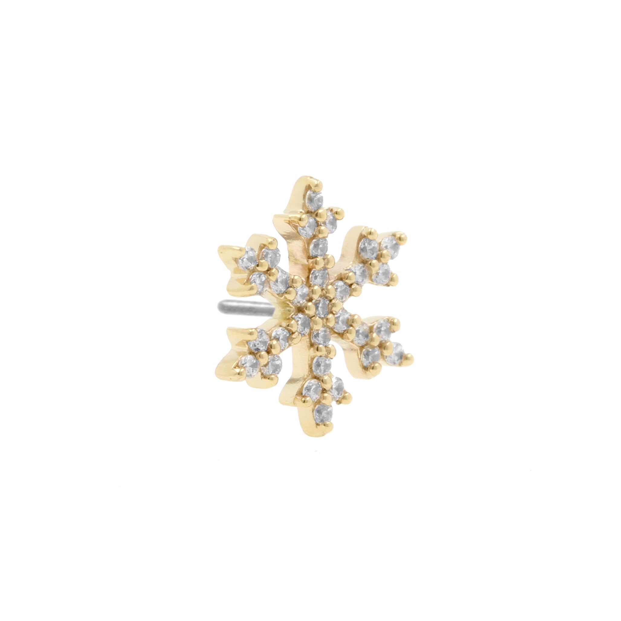 14 Karaats Gouden Sneeuwvlok Met Zirkonia geeft je piercing direct een stijlvolle uitstraling. Deze Threadless Top is vervaardigd uit 14 Karaats Goud. Dankzij het threadless systeem combineer je deze top eenvoudig met al onze staafjes, die wij Threadless Base noemen, voor een perfecte pasvorm en ultiem draagcomfort.