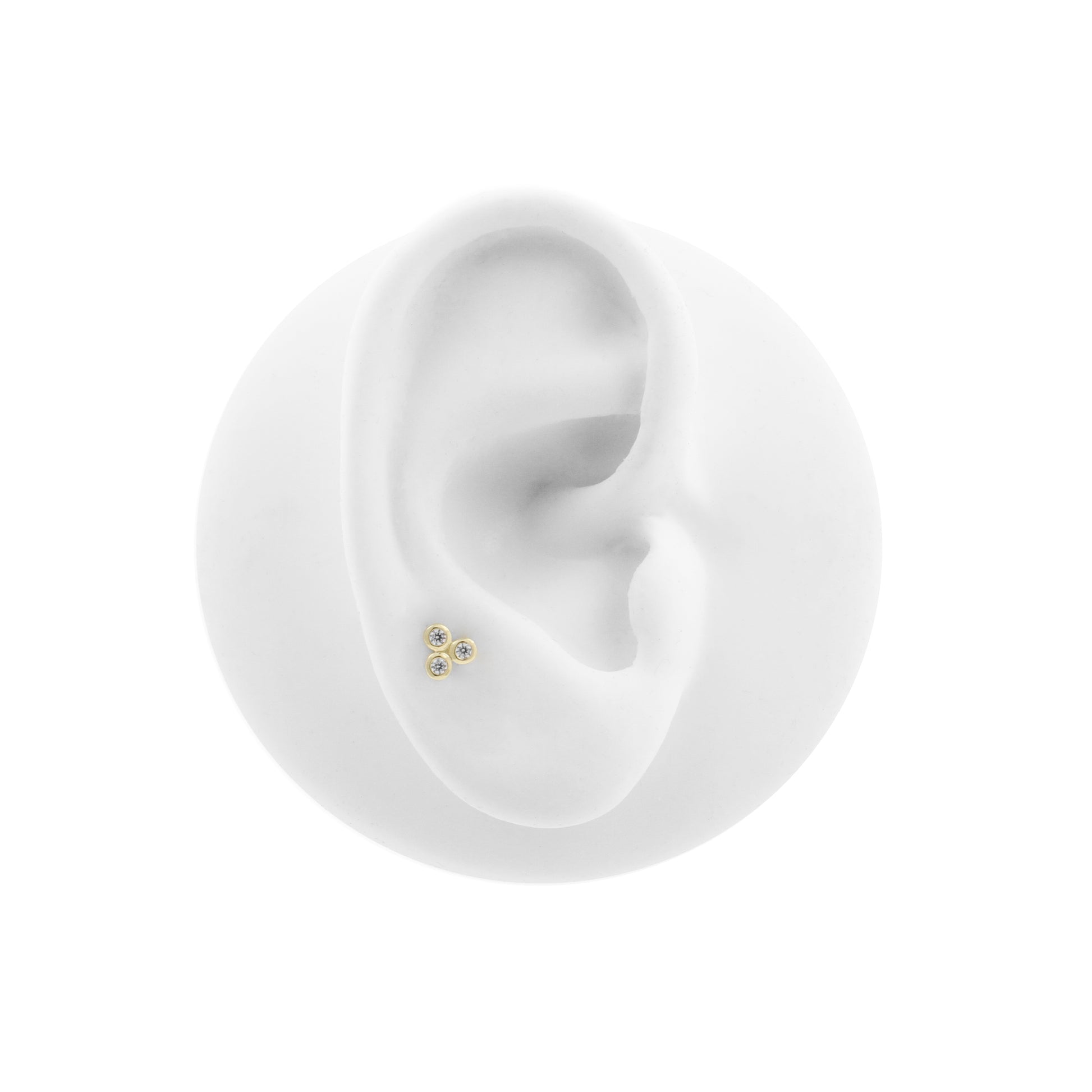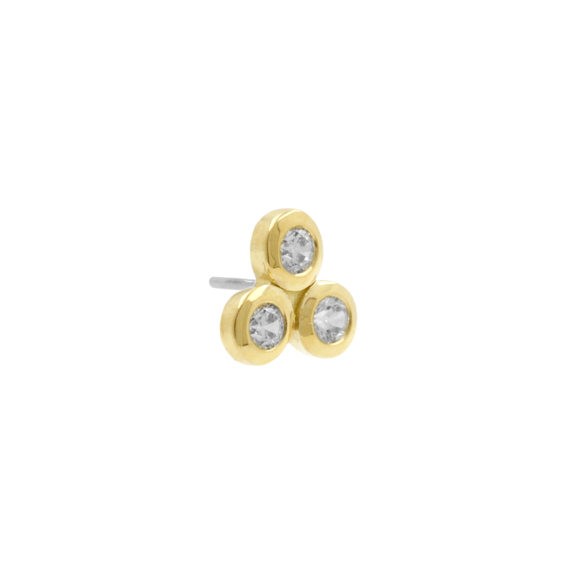 18 Karaats Gouden Zirkonia Cluster Top geeft je piercing direct een stijlvolle uitstraling. Deze Threadless Top is vervaardigd uit 18 Karaats Goud met een cubic zirconia in de kleur Clear. Dankzij het threadless systeem combineer je deze top eenvoudig met al onze staafjes, die wij Threadless Base noemen, voor een perfecte pasvorm en ultiem draagcomfort.