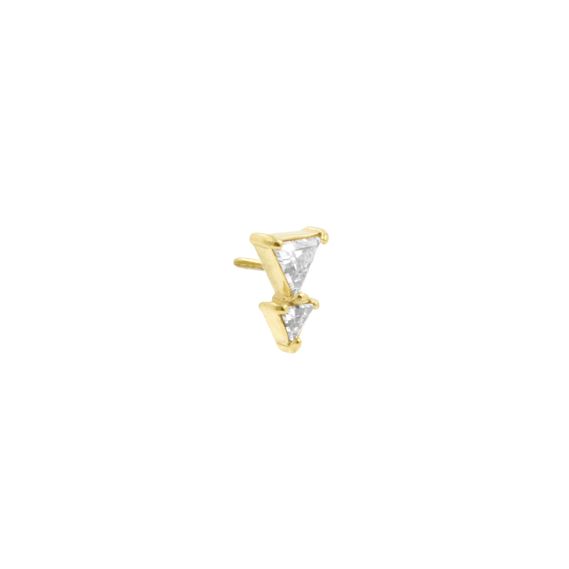 Nikkelvrij Staal - Zirkonia Double Triangle - Goud geeft je piercing direct een stijlvolle uitstraling. Deze Threadless Top is vervaardigd uit Nikkelvrij Staal met een cubic zirconia in de kleur Clear. Dankzij het threadless systeem combineer je deze top eenvoudig met al onze staafjes, die wij Threadless Base noemen, voor een perfecte pasvorm en ultiem draagcomfort.