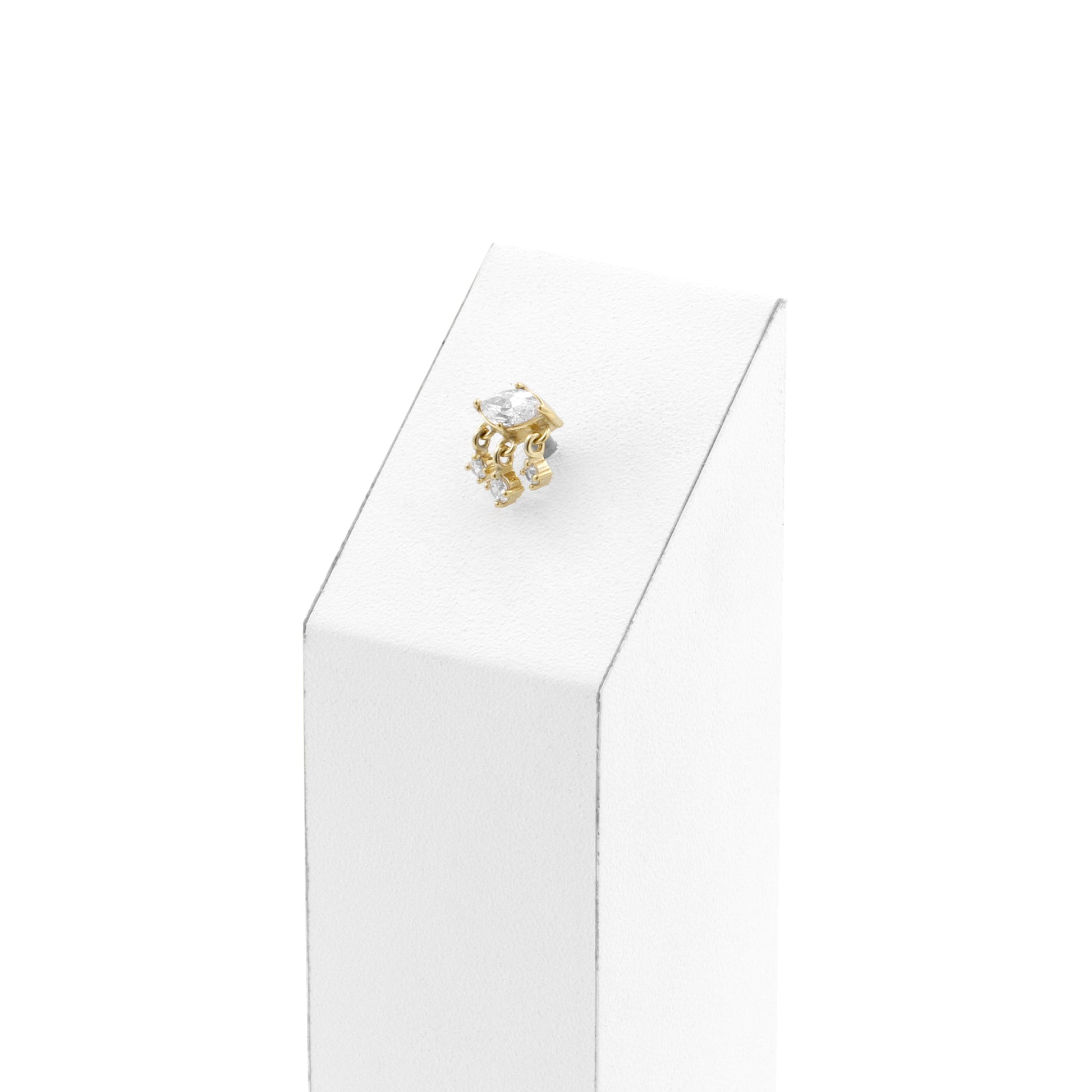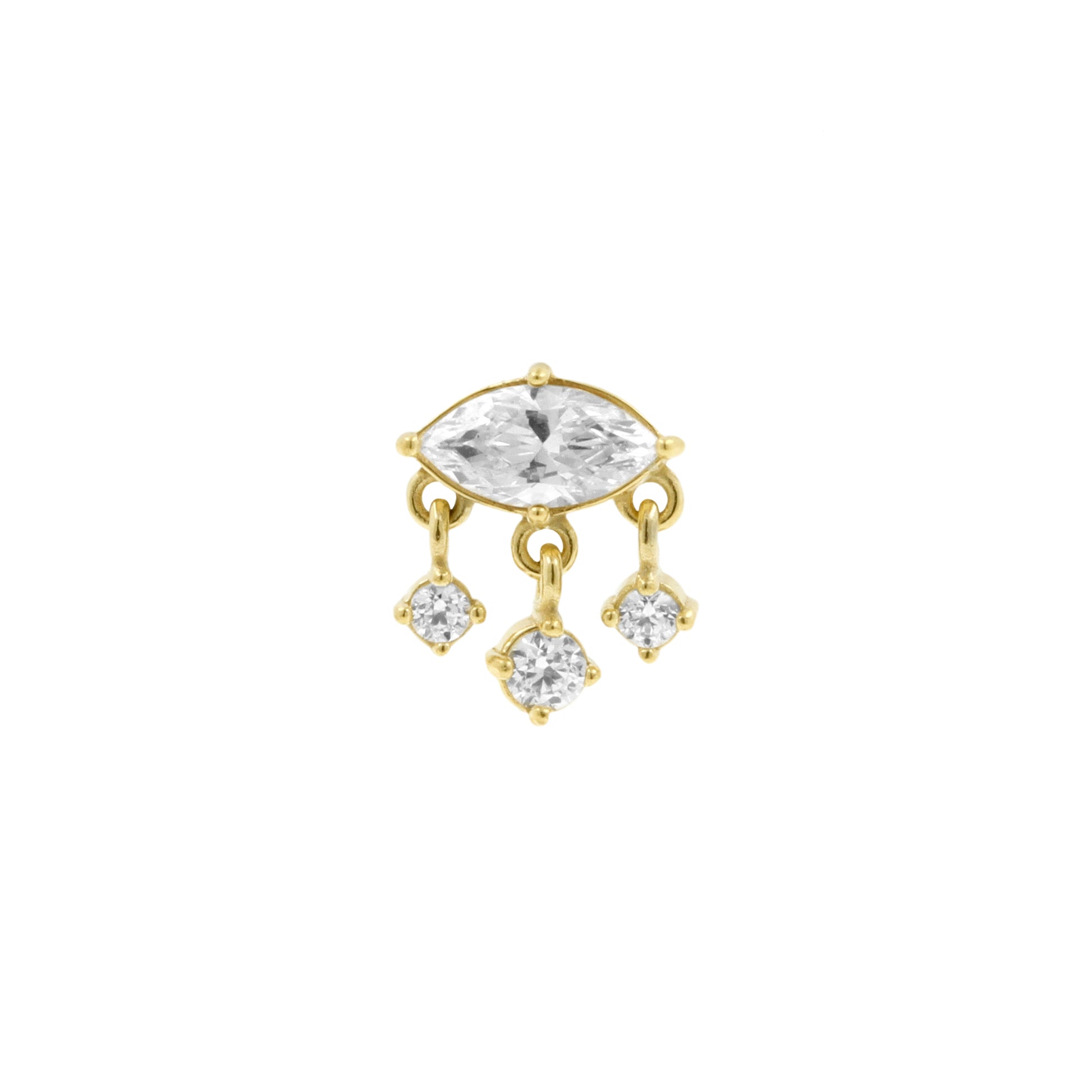 Nikkelvrij Staal - Zirkonia Eye Dangle - Goud geeft je piercing direct een stijlvolle uitstraling. Deze Threadless Top is vervaardigd uit Nikkelvrij Staal met een cubic zirconia in de kleur Clear. Dankzij het threadless systeem combineer je deze top eenvoudig met al onze staafjes, die wij Threadless Base noemen, voor een perfecte pasvorm en ultiem draagcomfort.