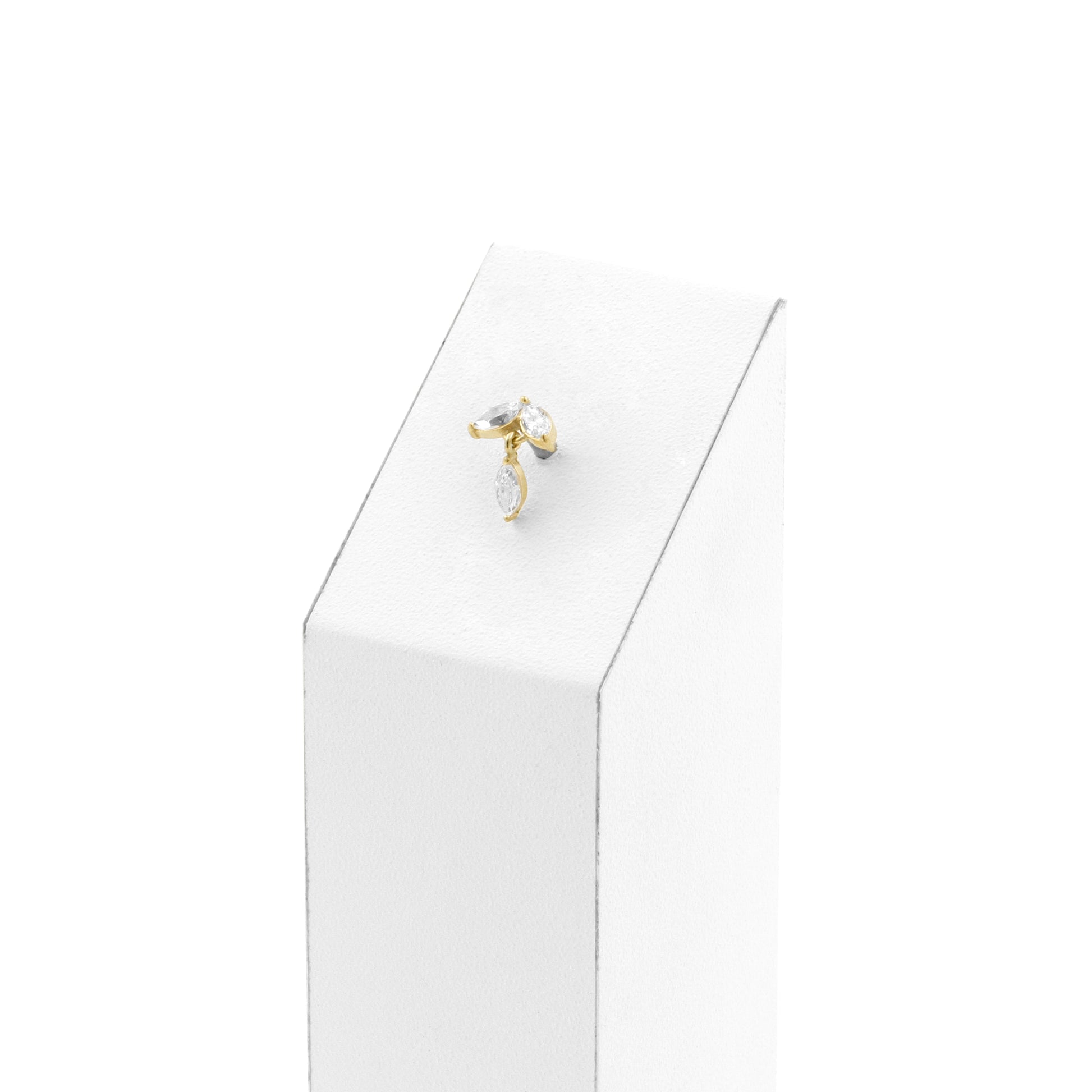 Nikkelvrij Staal - Zirkonia Marquise Dangle - Goud geeft je piercing direct een stijlvolle uitstraling. Deze Threadless Top is vervaardigd uit Nikkelvrij Staal met een cubic zirconia in de kleur Clear. Dankzij het threadless systeem combineer je deze top eenvoudig met al onze staafjes, die wij Threadless Base noemen, voor een perfecte pasvorm en ultiem draagcomfort.