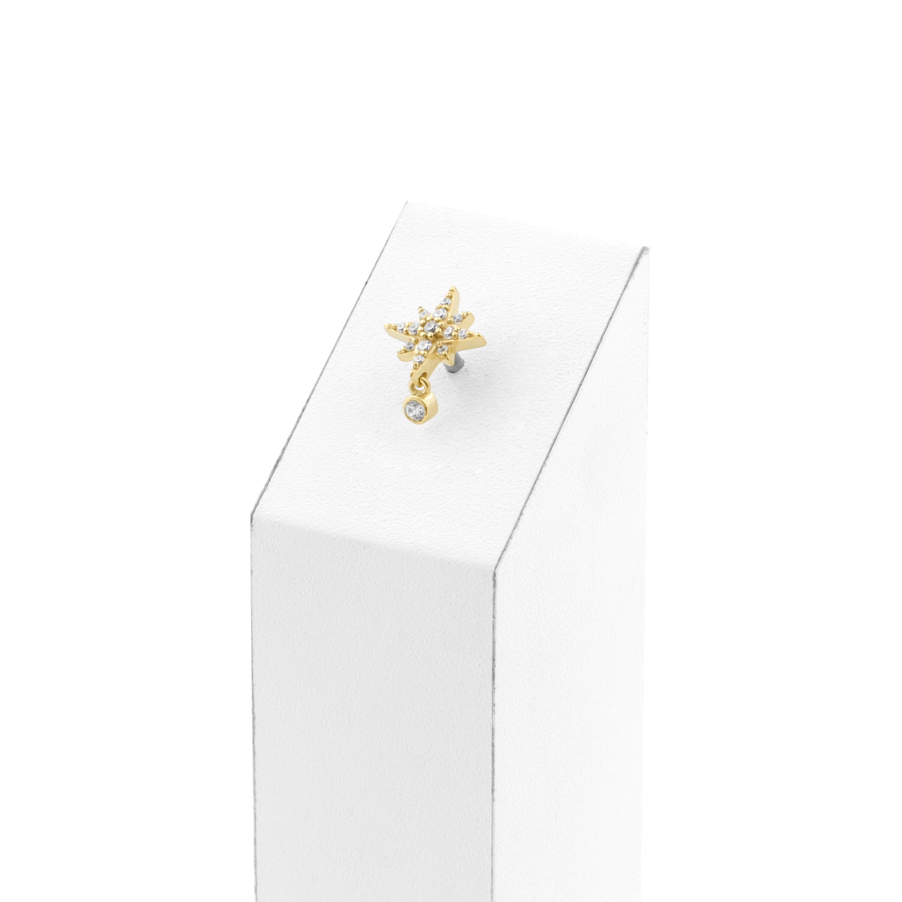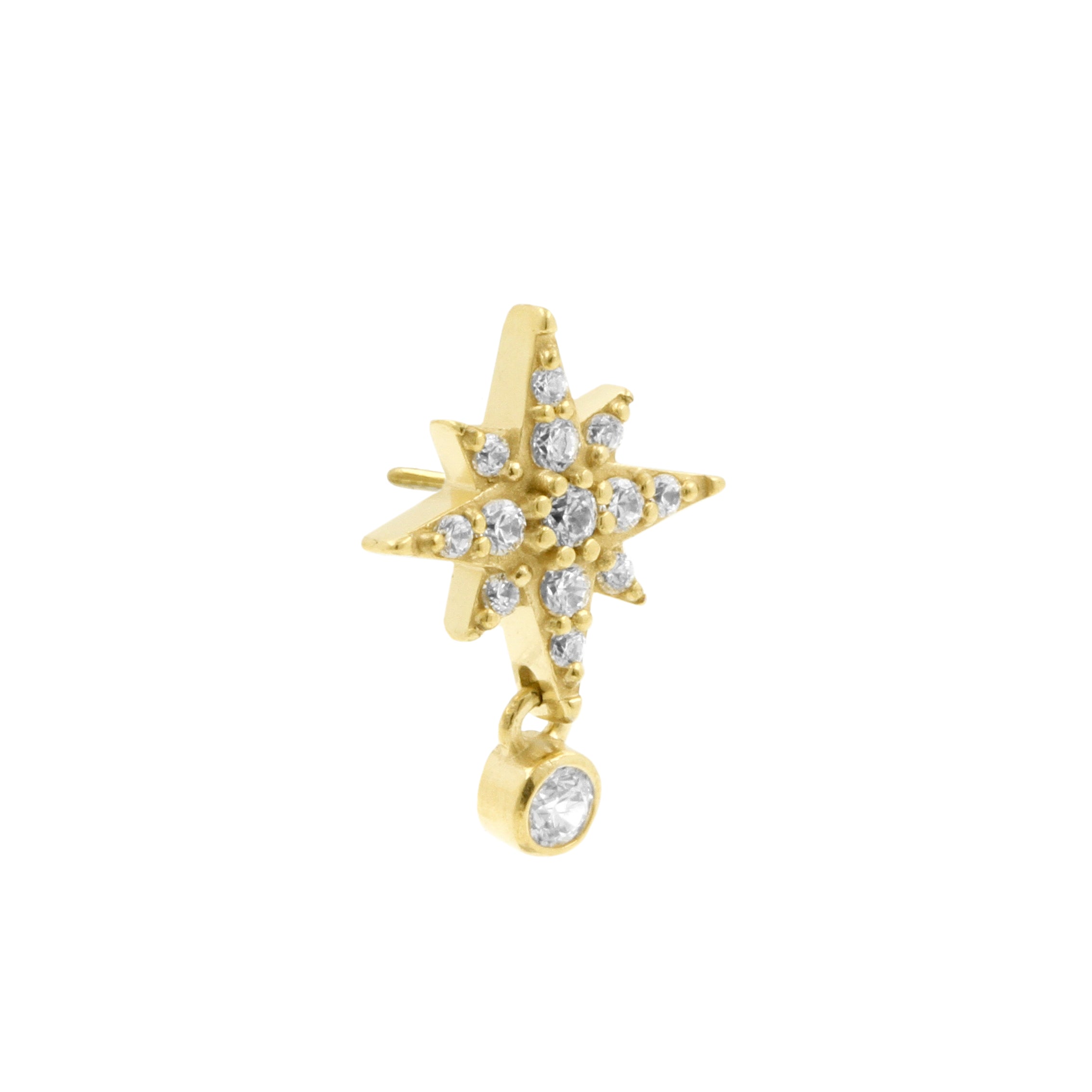 Nikkelvrij Staal - Zirkonia Star Dangle - Goud geeft je piercing direct een stijlvolle uitstraling. Deze Threadless Top is vervaardigd uit Nikkelvrij Staal met een cubic zirconia in de kleur Clear. Dankzij het threadless systeem combineer je deze top eenvoudig met al onze staafjes, die wij Threadless Base noemen, voor een perfecte pasvorm en ultiem draagcomfort.
