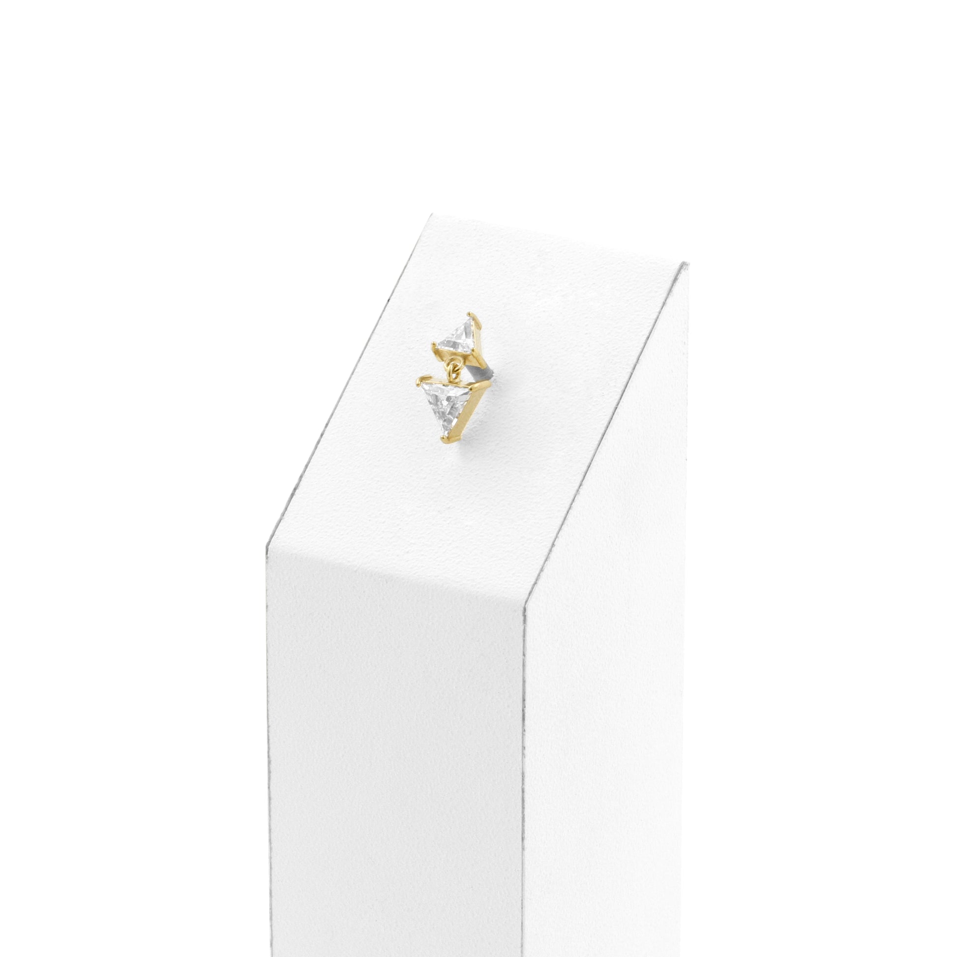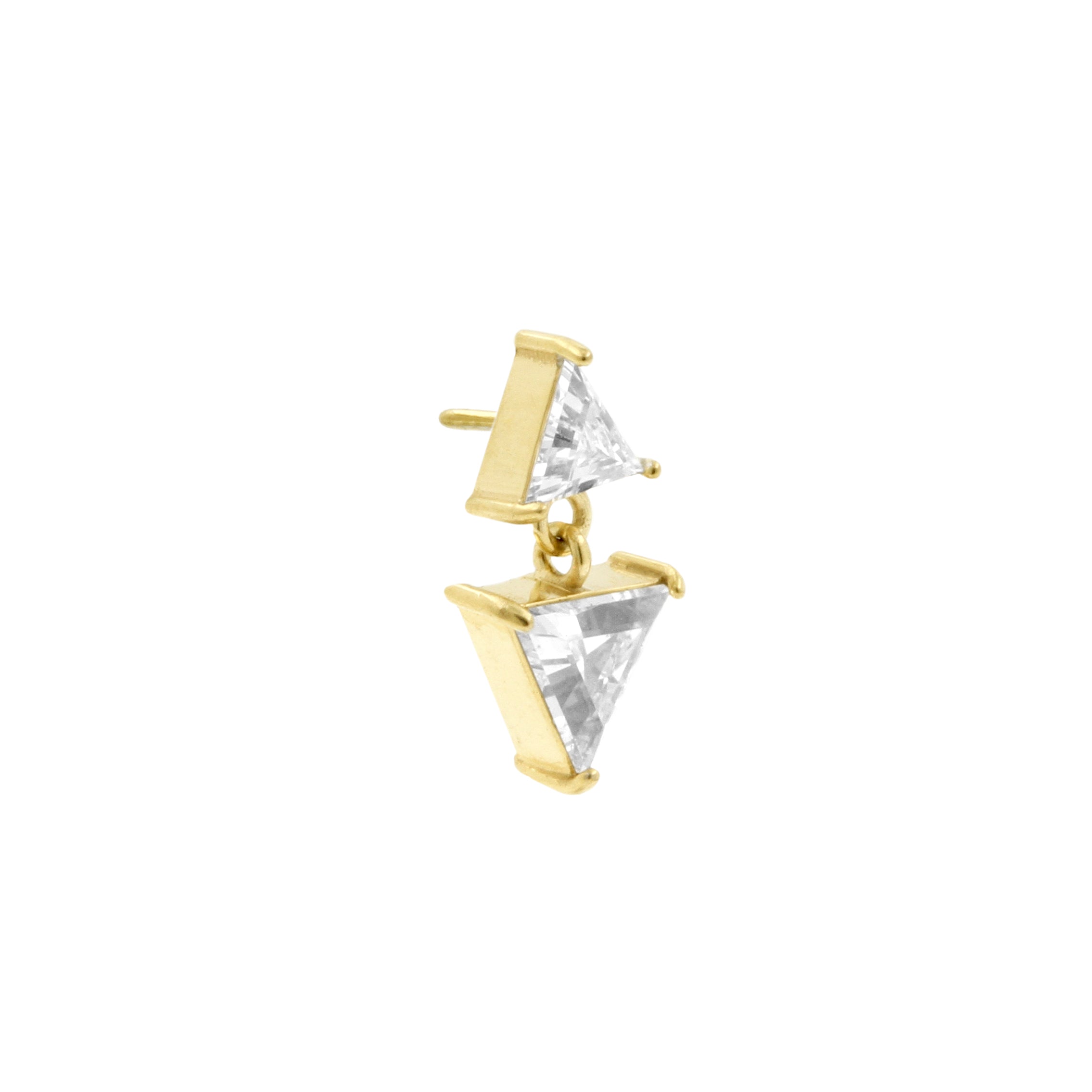 Nikkelvrij Staal - Zirkonia Triangle Dangle - Goud geeft je piercing direct een stijlvolle uitstraling. Deze Threadless Top is vervaardigd uit Nikkelvrij Staal met een cubic zirconia in de kleur Clear. Dankzij het threadless systeem combineer je deze top eenvoudig met al onze staafjes, die wij Threadless Base noemen, voor een perfecte pasvorm en ultiem draagcomfort.