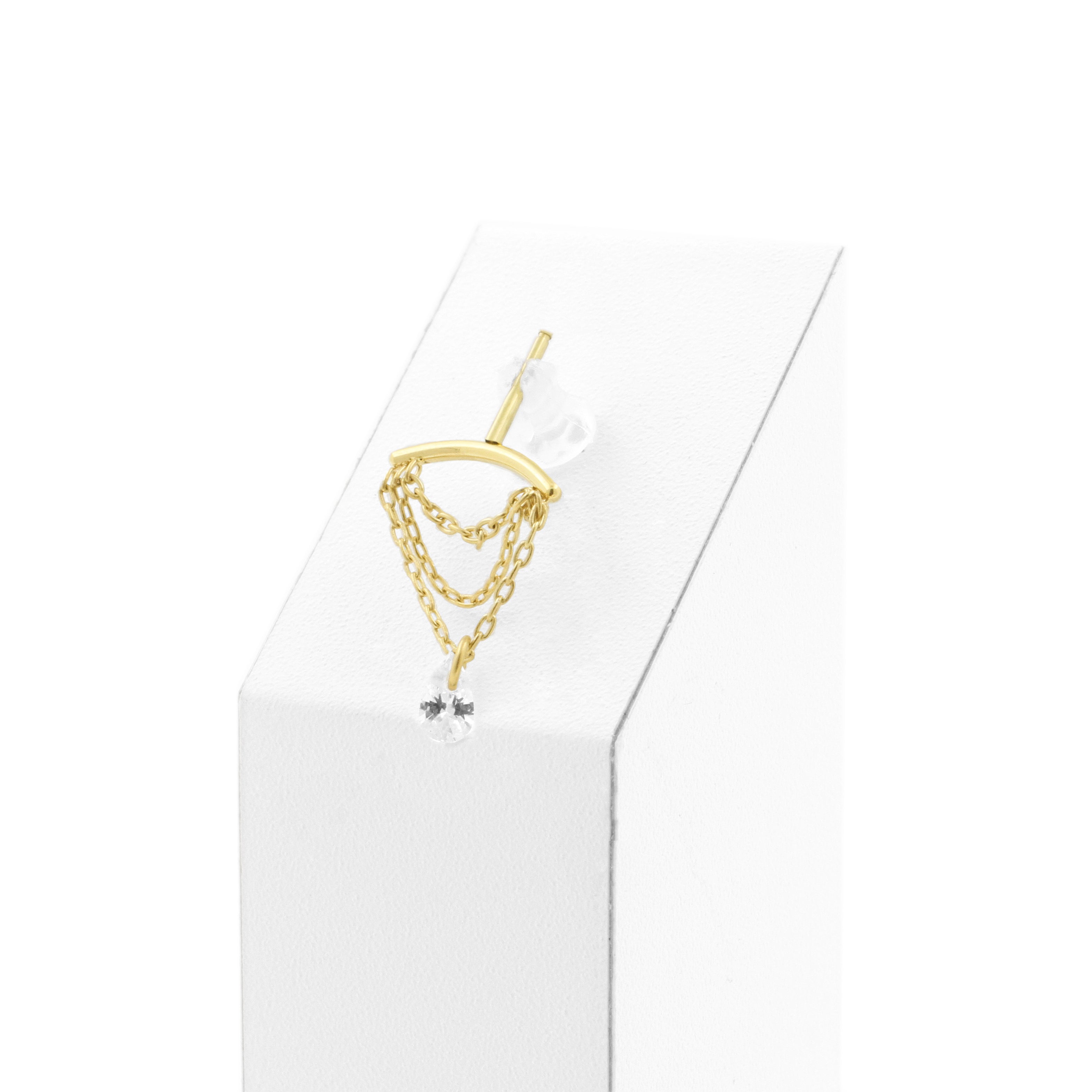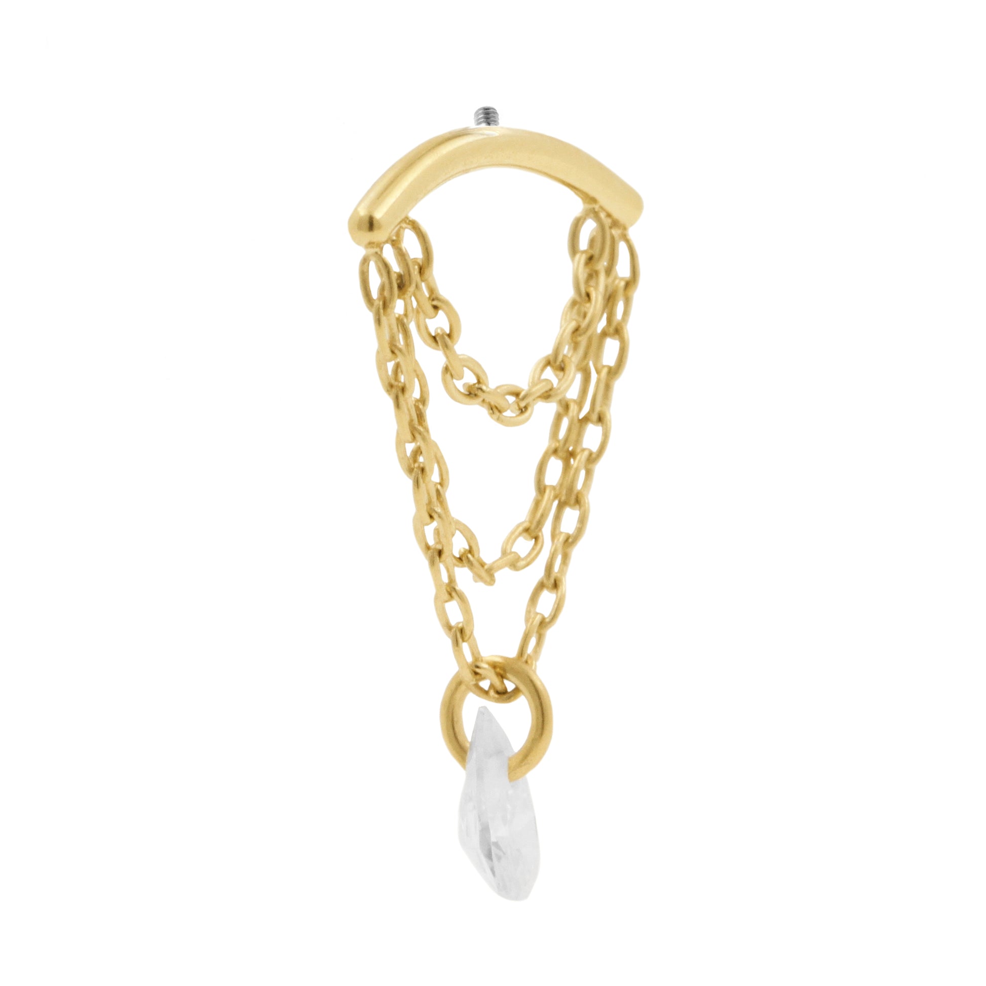 Geef je vertical helix piercing een elegante uitstraling met deze titanium curve, waaraan fonkelende clear cubic zirconia bungelen. Het titanium is afgewerkt met 18 karaats PVD gold coating die qua kleur matcht met ons echt gouden assortiment. Dit sieraad is internally threaded en geschikt voor gebruik met internally threaded staafjes van 1,2 mm, waardoor je het veilig en comfortabel kunt dragen.