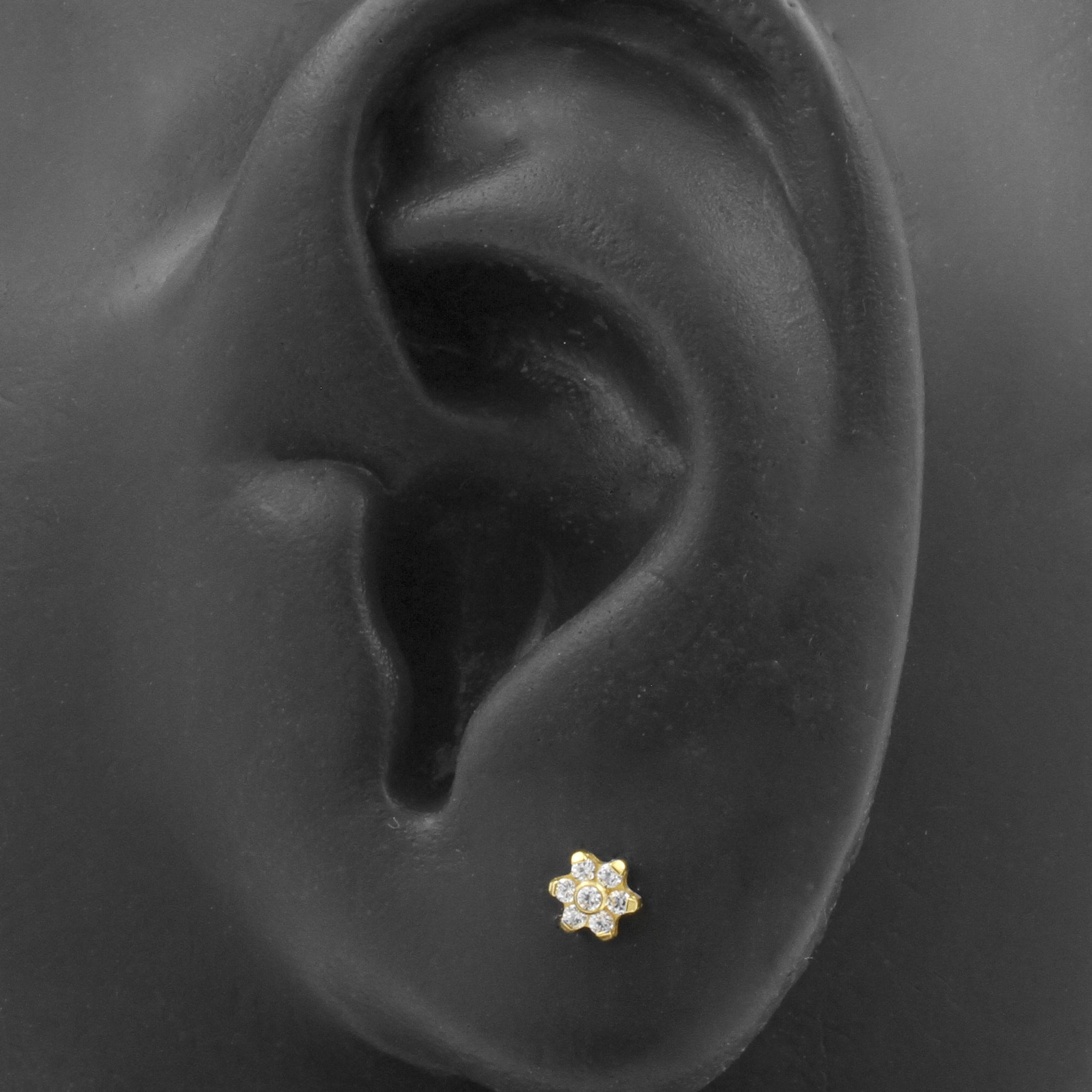 Titanium Zirkonia Bloem - Goud geeft je piercing direct een stijlvolle uitstraling. Deze Threadless Top is vervaardigd uit Titanium. Dankzij het threadless systeem combineer je deze top eenvoudig met al onze staafjes, die wij Threadless Base noemen, voor een perfecte pasvorm en ultiem draagcomfort.