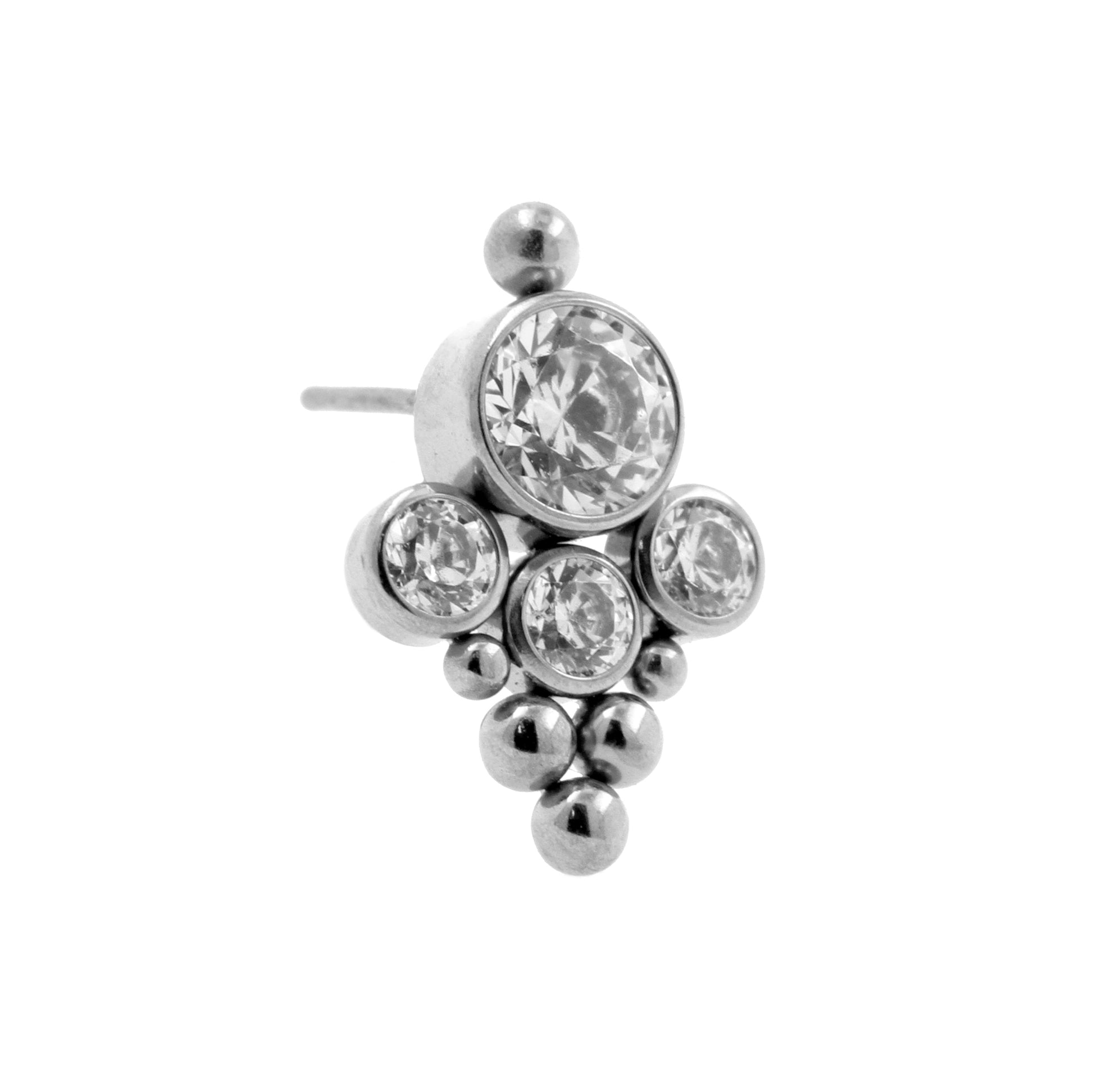 Titanium Zirkonia Cluster - Zilver geeft je piercing direct een stijlvolle uitstraling. Deze Threadless Top is vervaardigd uit Titanium. Dankzij het threadless systeem combineer je deze top eenvoudig met al onze staafjes, die wij Threadless Base noemen, voor een perfecte pasvorm en ultiem draagcomfort.
