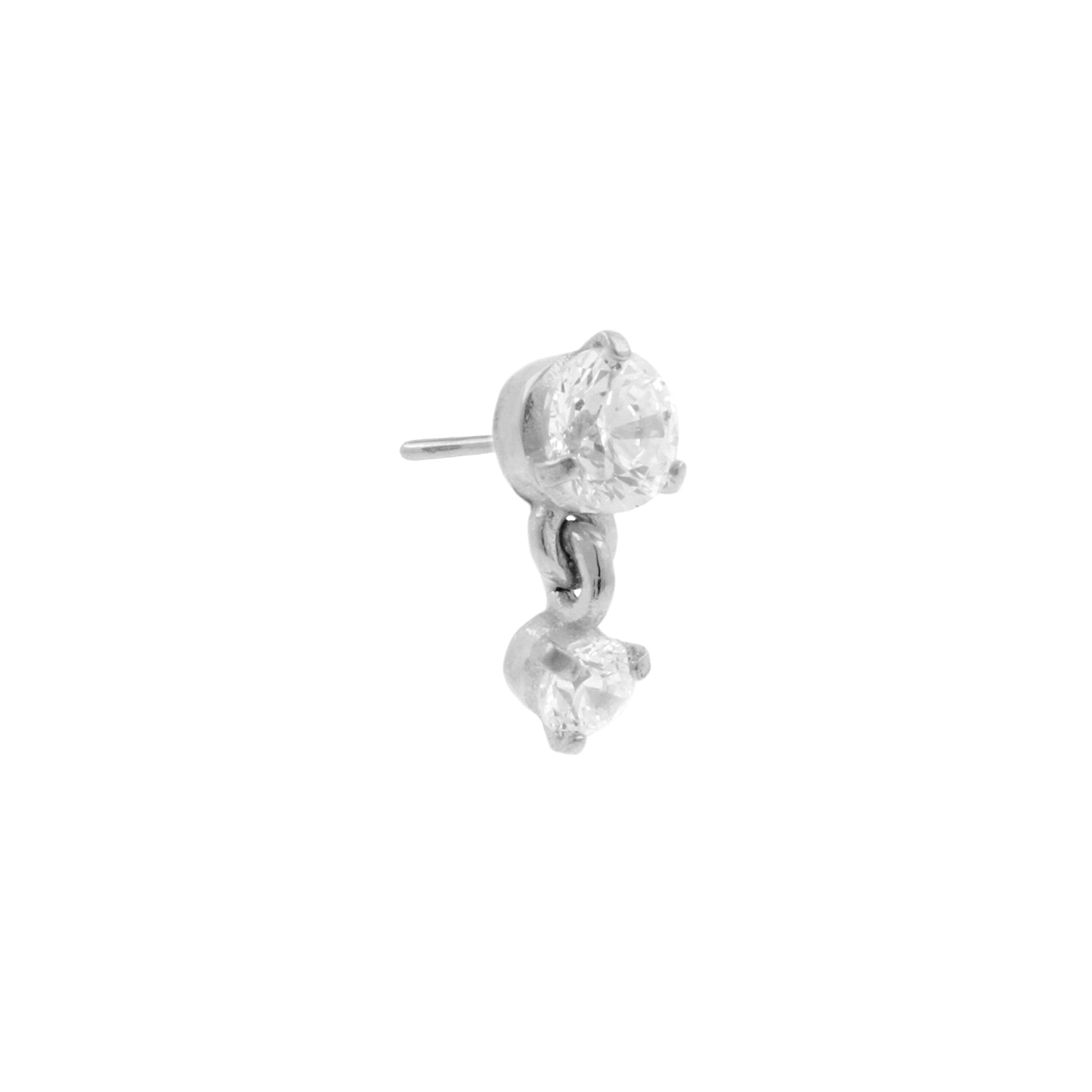 Elegante, subtiel bewegende glans — deze Threadless Top combineert twee zirkonia’s in een verfijnd design waarbij de kleine steen sierlijk bungelt onder de grotere. Verkrijgbaar in drie maten, zodat je precies de schittering kiest die bij jou past. Gemaakt van hoogwaardig, gepolijst titanium: licht van gewicht, sterk en hypoallergeen voor prettig draagcomfort, elke dag opnieuw.